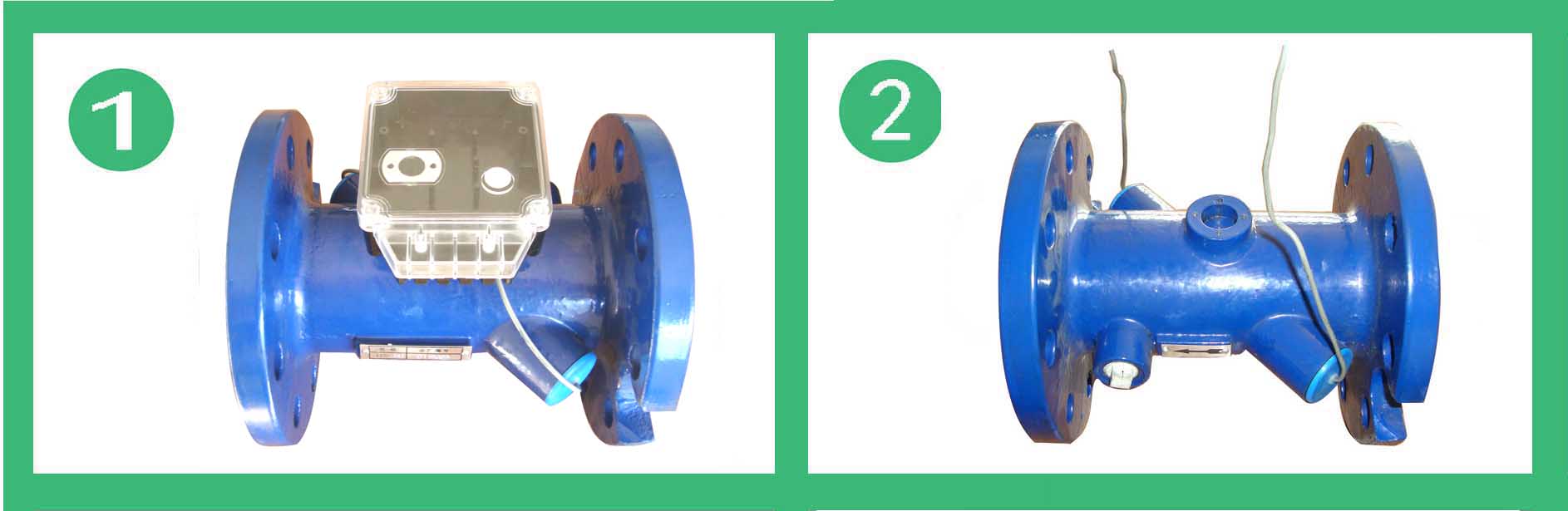b.樓棟型熱量表超聲波流量計由表殼、換能器、換能器座組成。順流方向和逆流方向,換能器1或換能器2發(fā)射的超聲波信號由換能器2或換能器1接收。