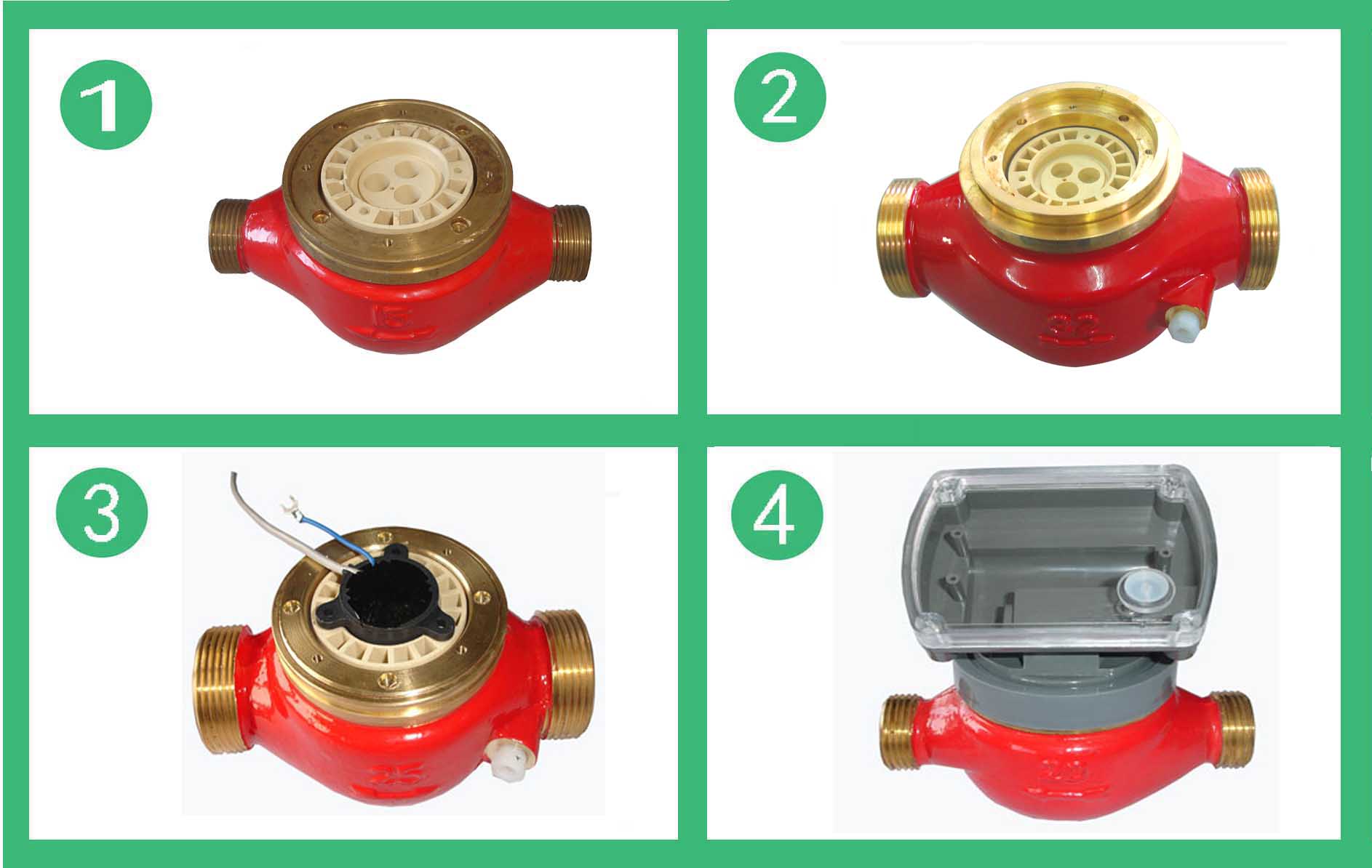 DS97TAR多流束無磁熱量表流量計(jì)的結(jié)構(gòu)如圖,其工作原理是:熱水進(jìn)入流量計(jì),經(jīng)進(jìn)水導(dǎo)向孔沖擊計(jì)量腔內(nèi)的葉輪旋轉(zhuǎn),再經(jīng)出水導(dǎo)向孔流出流量計(jì)。葉輪上面嵌有不銹鋼膜片,隨葉輪旋轉(zhuǎn),在隔板上端接近不銹鋼膜片處可裝電感類傳感器,接受葉輪旋轉(zhuǎn)的周期信號。