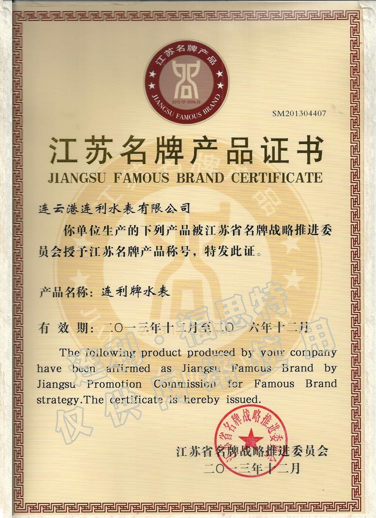 連利江蘇名牌產(chǎn)品證書