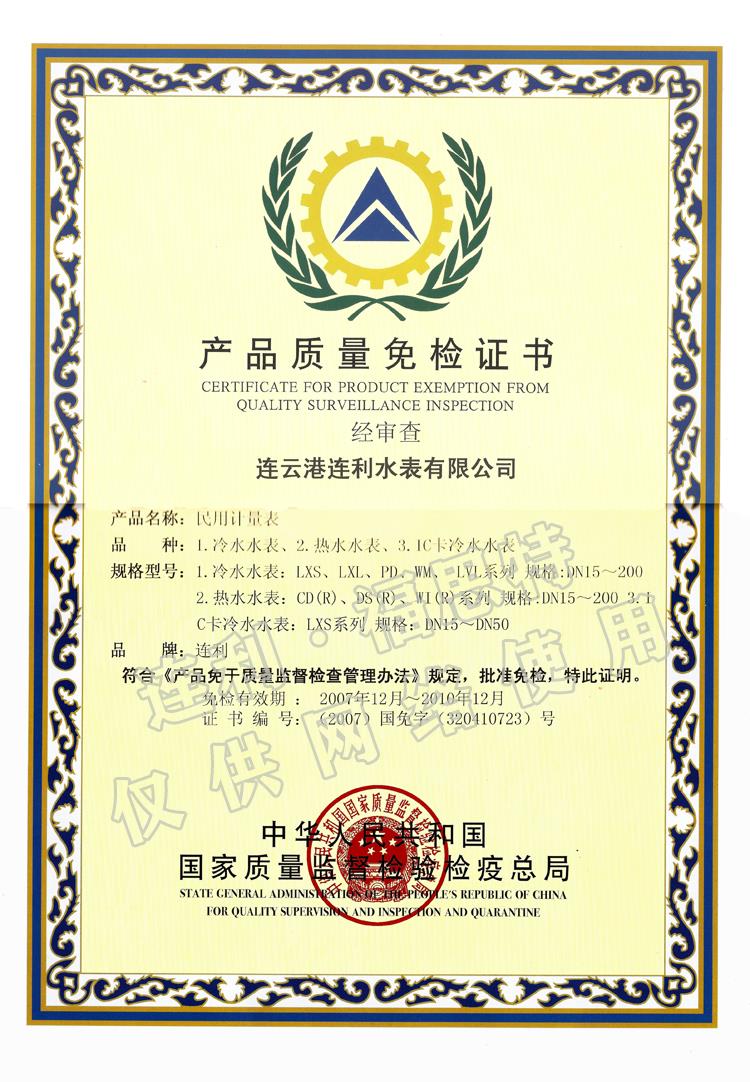 連利 產(chǎn)品質(zhì)量免檢證書